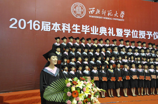 2016届毕业生代表、万象城娱乐allwincity体育冯芸同学代表全体毕业生向母校和老师表达了诚挚的感谢和深深的祝福。她说:海阔凭鱼跃,天高任鸟飞,是母校,给了我畅游的海,给了我高飞的天,母校以博大的胸怀包容我们,她用无悔的付出支持我们,感谢母校给了自己实现梦想的机会,感谢母校让我们的未来充满无限可能。她表示,今后绝不改变初衷,不埋葬理想,用意念消退盲目的怯懦,用执着洗却心间的迷茫,用坦然面对曾经的失败,让努力成为一种习惯,让优秀成为必然。冯芸同学大学期间努力学习专业知识,积极参加社会活动,获得了2015年甘肃省三好学生称号,甘肃省旅游系统技术能手,甘肃省青年岗位技术能手,甘肃省导游大赛英文组三等奖,万象城娱乐allwincity体育学习优胜奖、品德优秀奖、文体优胜奖等多项殊荣。她还是一个优秀志愿者,演讲台上的强者,运动会上的健儿,话剧社里的优秀演员。她在学好自己本科专业的同时,辅修了法律专业,大三顺利通过全国司法考试。大学四年的不懈努力,她成功获得保研资格,2016年秋季将在兰州大学攻读法律硕士。